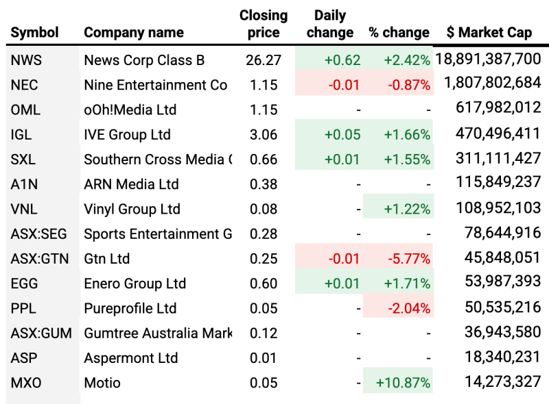 Other local players in positive territory included Enero (up 1.7%), Ive Group (also up 1.7%), Southern Cross Austereo (up 1.6%) and Vinyl Group (up 1.2%).