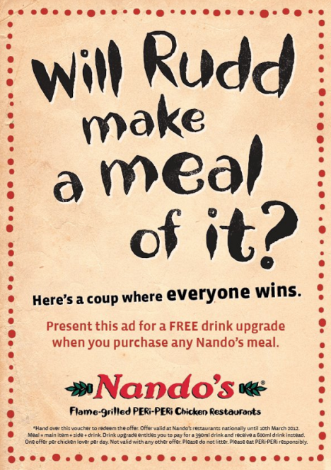 Nando’s has joined the tactical advertising frenzy around the Labor leadership contest with an ad that mocks former foreign minister Kevin Rudd’s bid for control of the party.