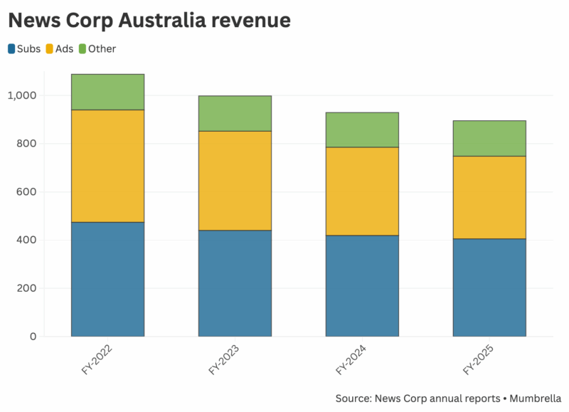 The Australian business, which is split out into “Advertising”, “Subscription and circulation” and “Other” lines, saw total revenue go 2% backwards year-on-year. Advertising revenue was down 5%. Stacking the numbers for the past four financial years shows a clear downward trend (see graph). Because News Corp does not break out EBITDA or net income numbers for Australia, it is not possible to judge Australian cost management and profitability from these accounts.