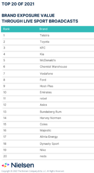 Nielsen Sport has provided Mumbrella with a list of which sponsor brands generated the highest value exposure through live sports broadcasts across 2021, as featured on yesterday’s Mumbrellacast.