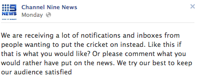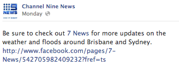This is not the first “off message” post on the page. In recent days, the account has not only “liked” the Seven News Facebook page, but has also asked users whether or not Nine should broadcast the cricket instead of its flood coverage.