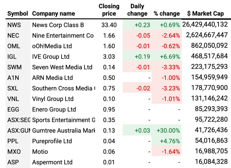 Australia’s listed media and marketing companies started the week in negative territory, with most of the Unmade index going backwards.