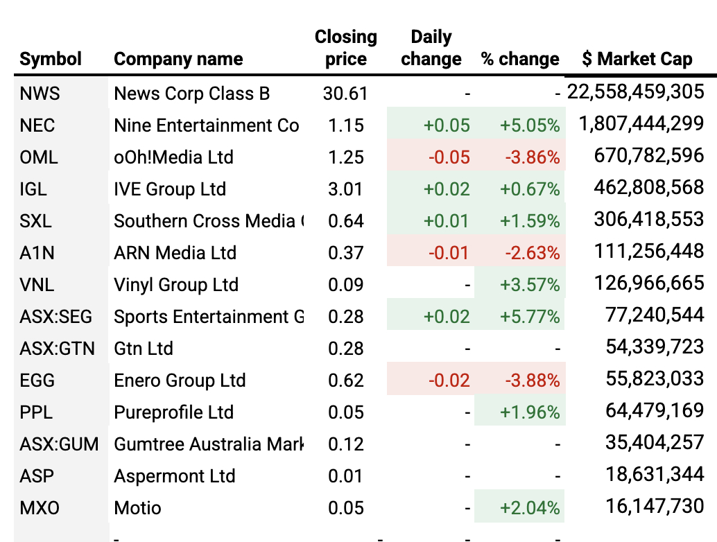 Nine Radio fetched a nice price — $56m — for an enterprise that Nine says was going to make it $6m in EBITDA in 2026. Nine was up 5.05% at the end of the day, joined by Sports Entertainment (+5.77%), Vinyl (+3.57%), Southern Cross (+1.59%), Ive (+0.67%), Motio (+2.04%), and Pureprofile (+1.96%).