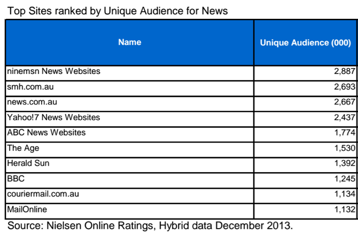According to the Nielsen Online Ratings for December NineMSN’s audience had a small increase from 2.885m to 2.887m in December, as the number of unique visitors fell away from the Sydney Morning Herald’s site and News Corp Australia’s News.com.au.