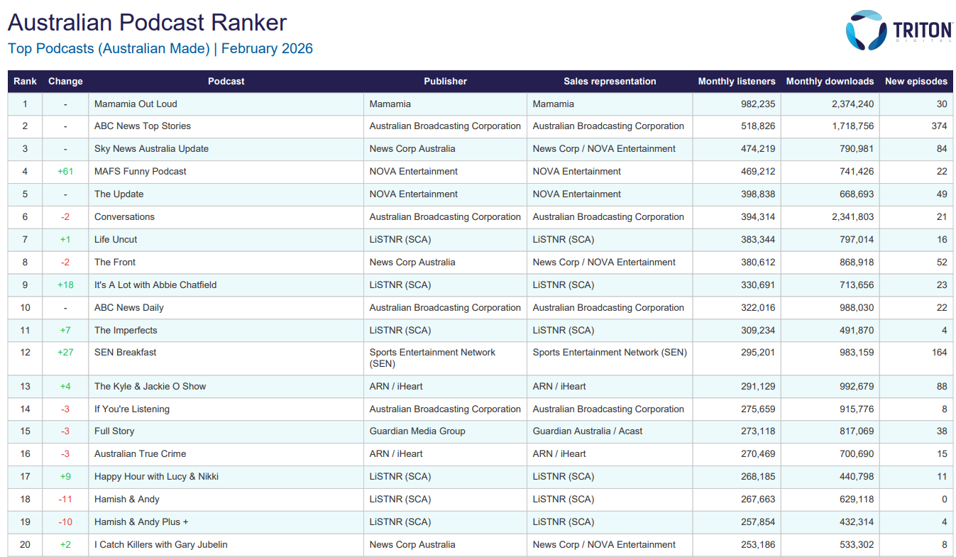 Mamamia Out Loud has maintained the top position for the second month in a row, after cracking #1 for the first time in January, due its counter-programming strategy of plying listeners with new content over the usually quiet summer period.