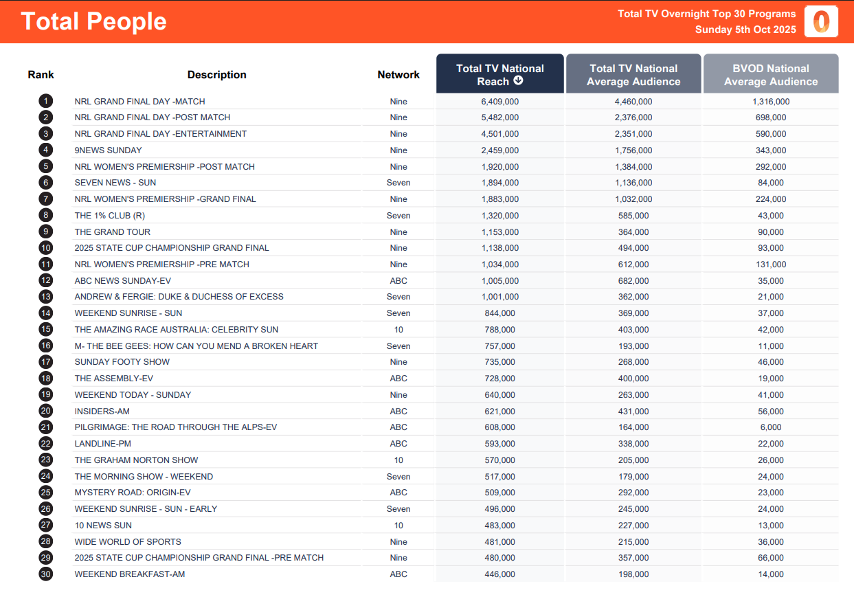 With average audiences of 4.46 million throughout the nail-biter — which saw Brisbane beat Melbourne 26 – 22 — (including streaming audiences of over 1.3 million), Nine’s broadcast comfortably drew more viewers than the prior weekend’s AFL Grand Final (on Seven), which had average audiences of 4.1 million, and 6.1 million viewers in total (including 969,000 on streaming)