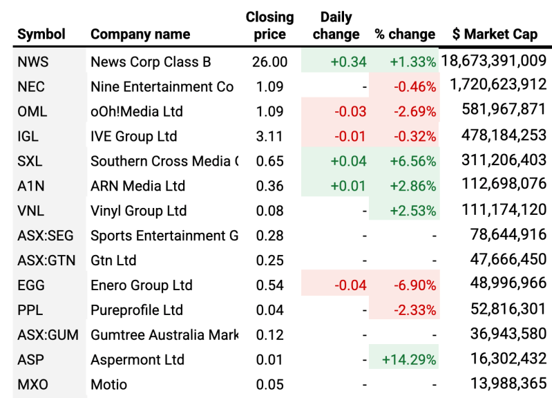 However, the audio sector enjoyed a much better day. Southern Cross Austereo rose by 6.6% and ARN Media rose by 2.9%.