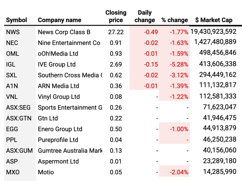 Among the broadcasters, Nine lost another 1.6% to land on another record low of $1.4bn; SouthernCross Austereo lost 3.1% and ARN Media lost 1.4%.