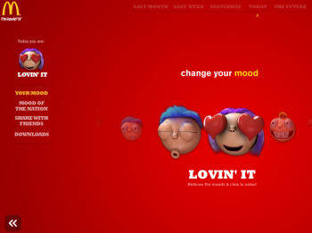 The McDonald’s ‘Mood of the Nation’ microsite is a light-hearted and playful extension to the integrated ‘Love Food For Any Mood’ campaign. With product awareness and retail messaging being driven largely by TV and outdoor, the role of the microsite is to provide additional brand-focused engagement and to use the emoticons, a fundamentally digital icon, to help spread awareness of the brand and the campaign through social channels.