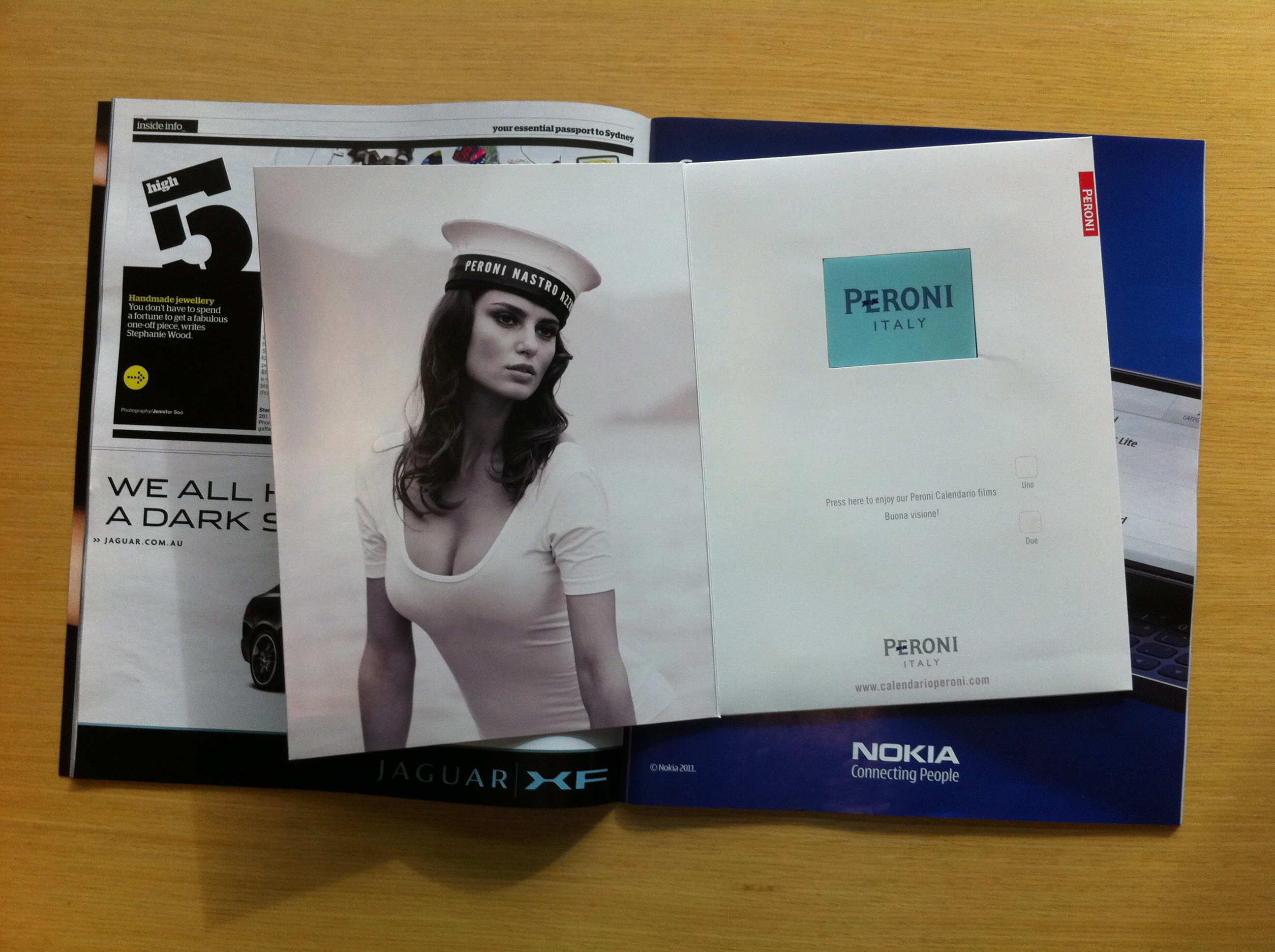 Through a deal with Fairfax, a recreation of the premium Italian beer’s 1960’s Calendario TV commercial will appear on credit card sized video screens in The (Melbourne) Magazine in The Age and The (Sydney) Magazine with The Sydney Morning Herald. The reader can even change channels between two commercials.
