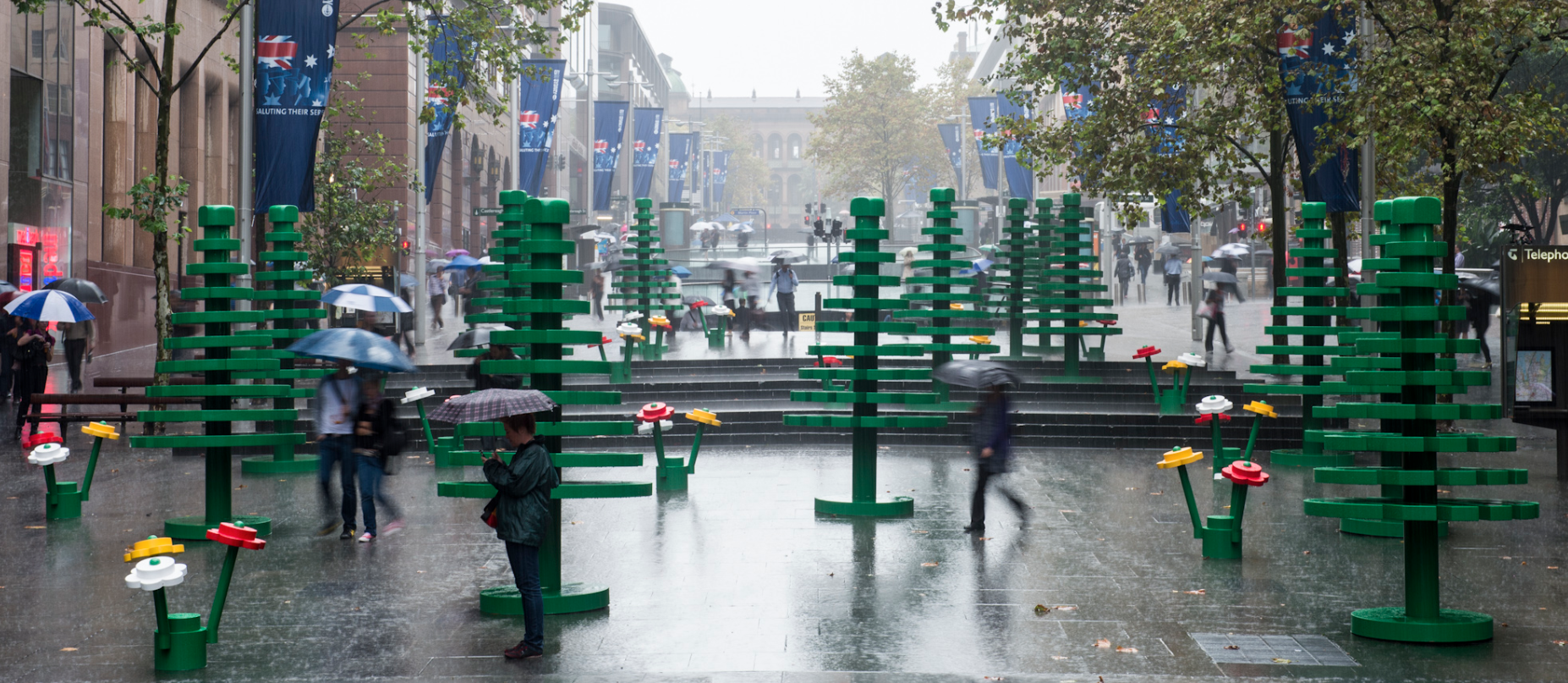 Heavy rain in Sydney put a slight dampener on an experiential campaign by Lego, in which a pop-up forest was made out of the famous toy bricks at Martin Place.