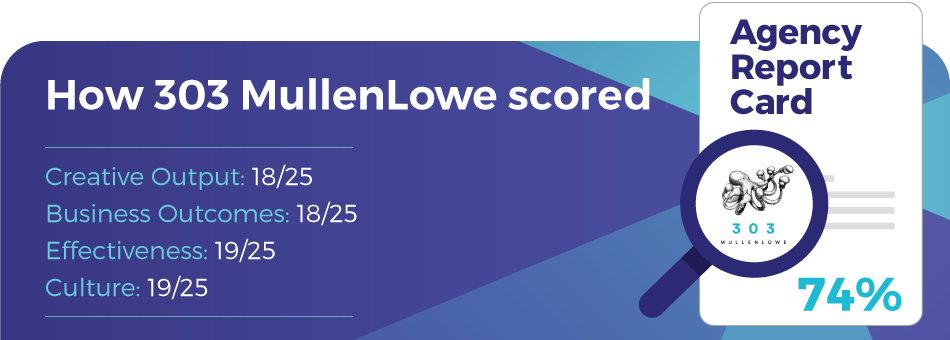 303 MullenLowe has consistently produced good work for good clients. However, the agency has managed to fly well below the radar, and perhaps this is deliberate. The agency could benefit from a bit more PR and award presence, but other than that, the agency has a lot to be proud of.