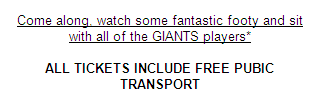 Public transport gets called a lot of things. In an email invitation to the fans of the Great Western Sydney Giants to watch a match against the Sydney Swans it gets a particularly grubby association.
