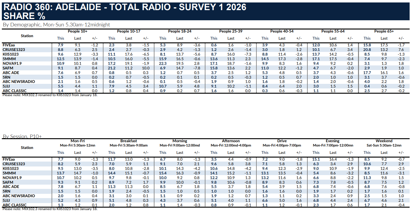 FiveAA and ABC Adelaide are in second and third (both AM stations) while the closest FM competitor to Triple M in breakfast is Nova’s Jodie Oddy and Andrew Hayes, who scored a 9.7.