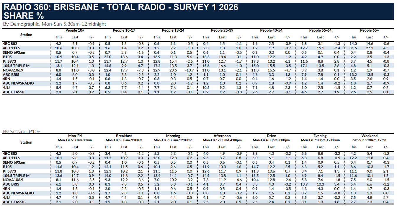 Triple M rose 1 point to remain Brisbane’s top station, with 13.1, while Kiis slid into second, up 1.3 to 11.7.