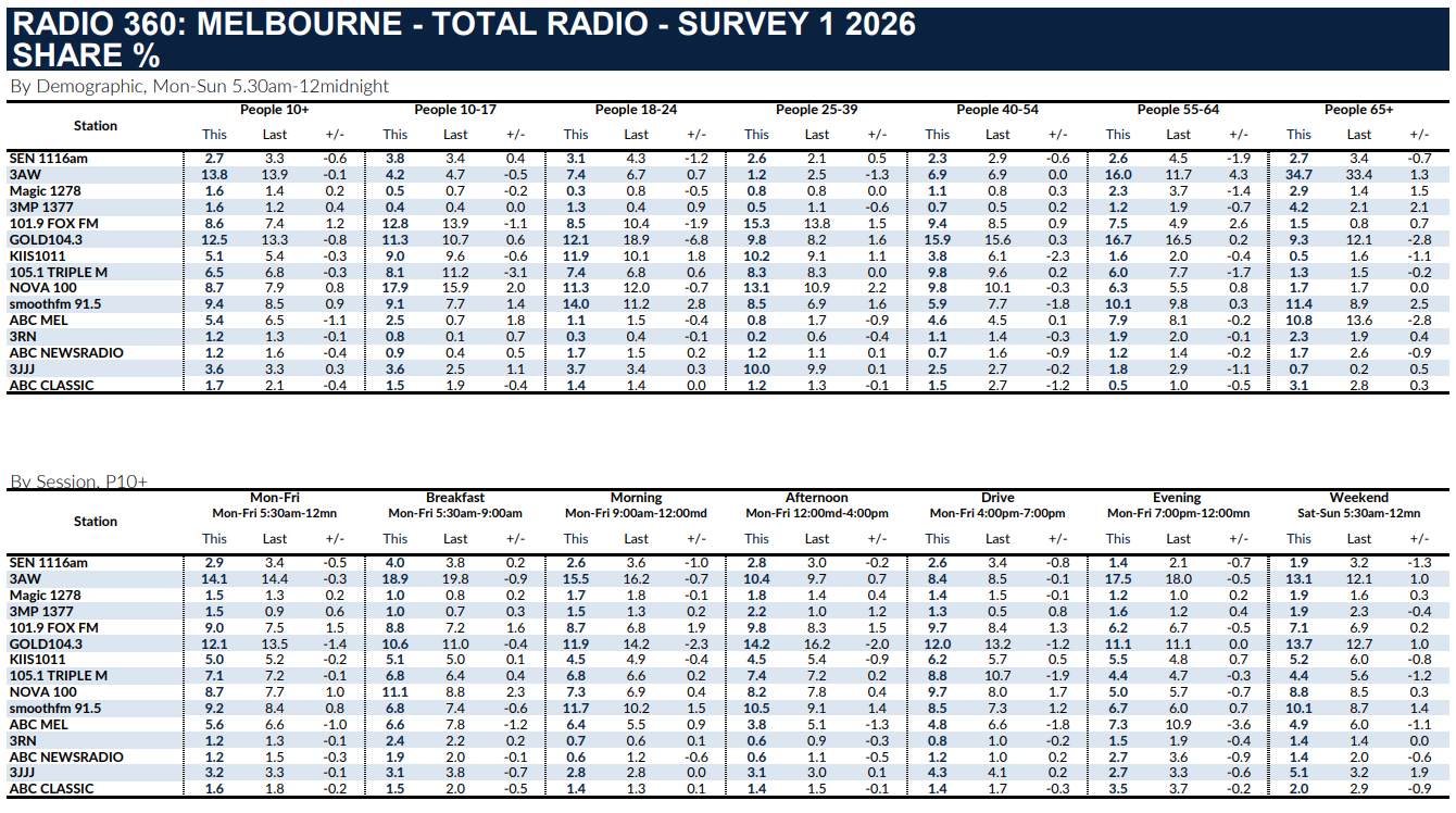 As mentioned, overall Gold dropped 0.8 points, but remained in the (FM) lead with 12.5 points (3AW is #1 overall, with 13.8). The closest contender to Gold on the FM band is the similarly targeted Smooth, with 9.4, while Smooth’s sister station Nova sits in third, with 8.7 (down 0.8).