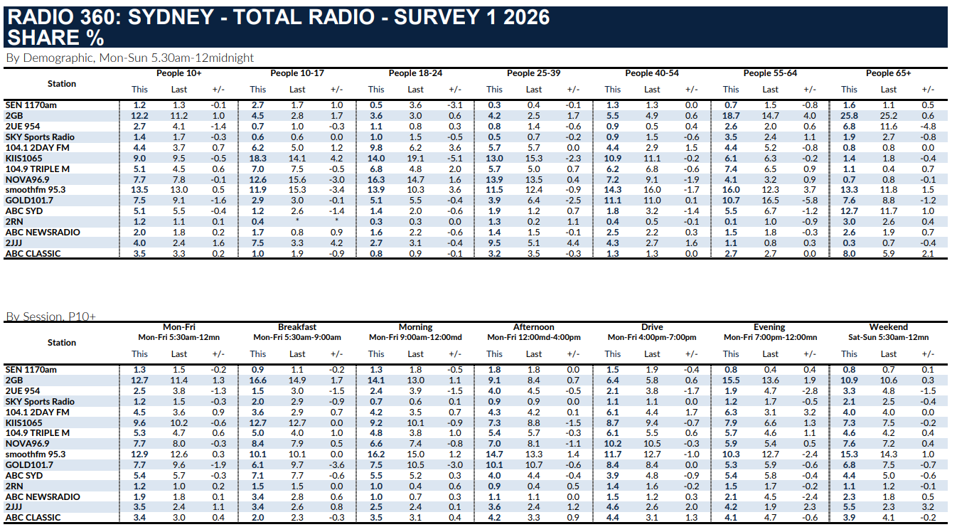 In terms of the Sydney stations, Smooth is again the top dog, with its 13.5 points (up 0.5) remaining ahead of 2GB’s 12.2, despite the latter gaining a point this book. Kiis dropped 0.5 to sit at third overall with 9 points.