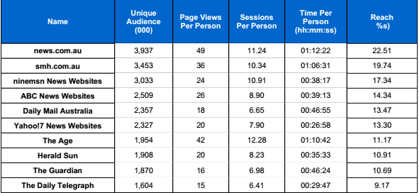 News.com.au extended its lead at the top of the table with a unique audience of 3.937m readers, it’s biggest ever audience, which Nielsen says gives it an audience reach of 22.51 per cent. Smh.com.au dropped slightly but maintained second place with 3.453m, whilst Ninemsn’s suite of sites is third with 3.033m readers, with the site continuing as the logoff page for the Microsoft Outlook email service.