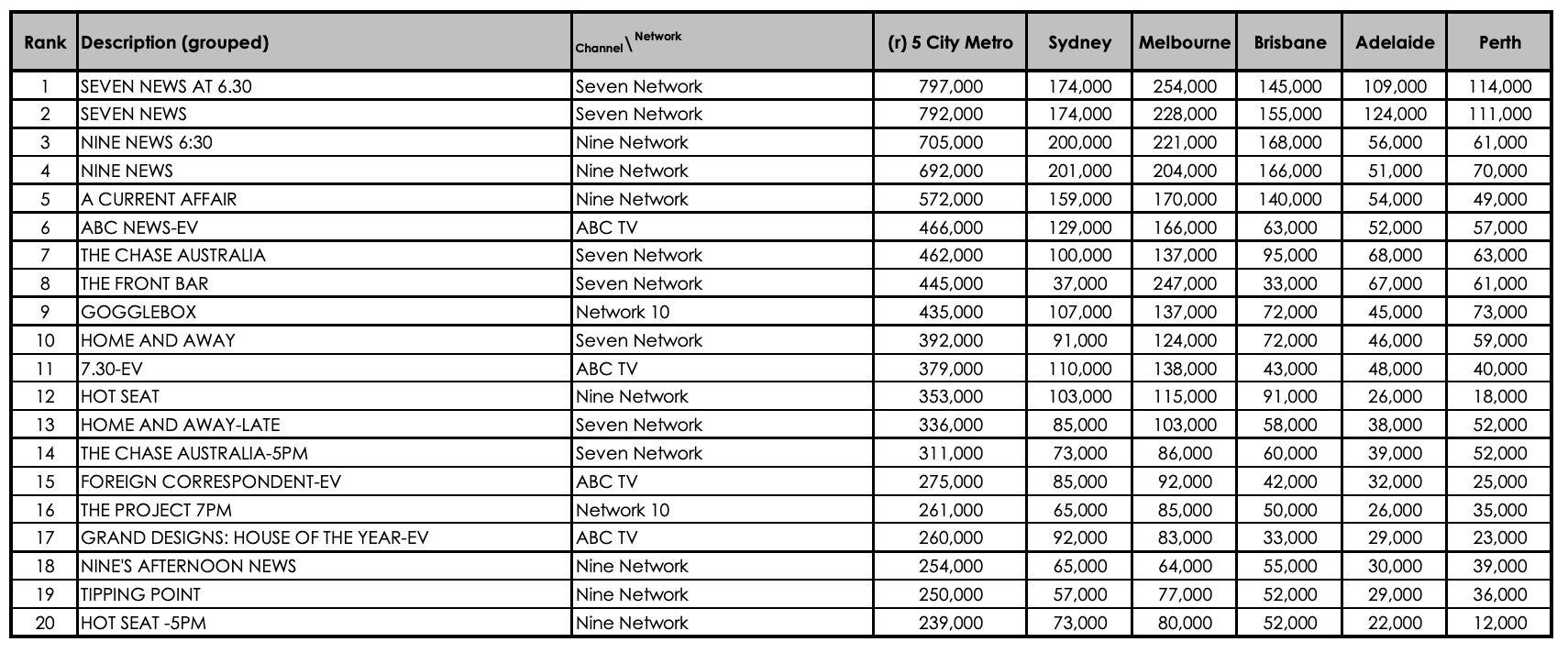 A Current Affair helped Nine hold 27.8% of the audience, while Gogglebox was the big winner for Ten, being the #1 show in under 50s, and 16 to 39s.