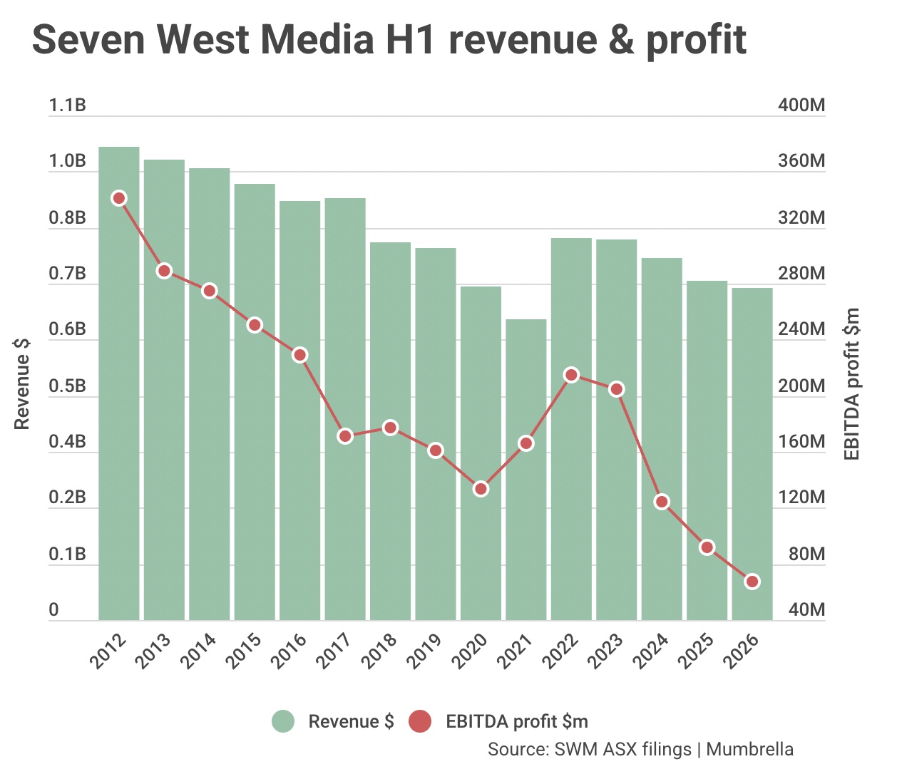 SWM’s EBITDA for the half of $67m was down 27% ($25 million) on the same period a year earlier, which management said was “in line with November AGM guidance”. While Seven warned investors of headwinds during its AGM, it didn’t put an explicit figure on the earnings fall.