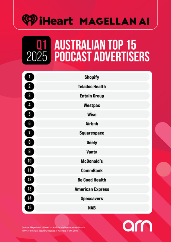 iHeart and Magellan AI have released the top 15 podcast advertisers in Australia for Q1 2025.