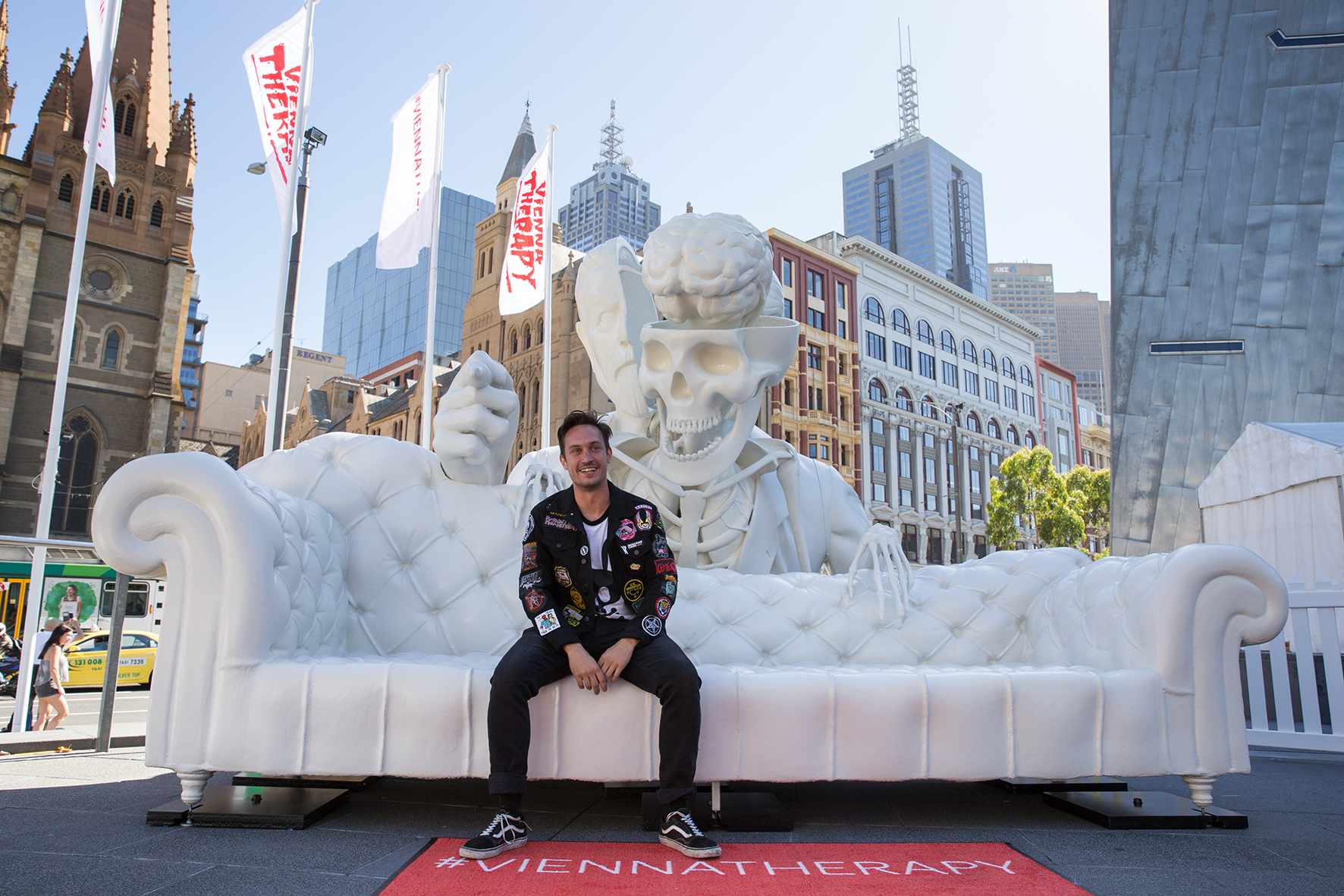 Freud is surrounded by a three-dimensional white sculpture which was created by Vienna Street artist Nychos and includes a couch for passers-by to sit on and put themselves ‘up for analysis’.