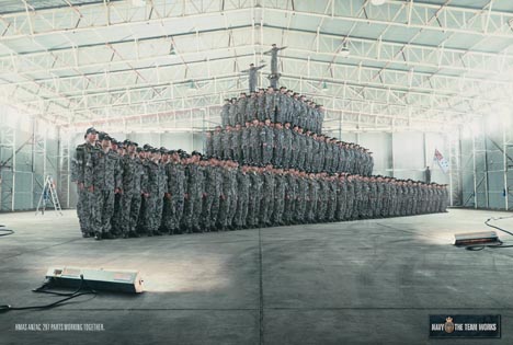 The importance of teamwork in the navy is depicted in the shape of a battle cruiser made from hundreds of recruits. The execution also shows that the navy is not just about ships, sheet metal and rivets – it’s about people. The ad won best corporate and government service at the Caxtons.