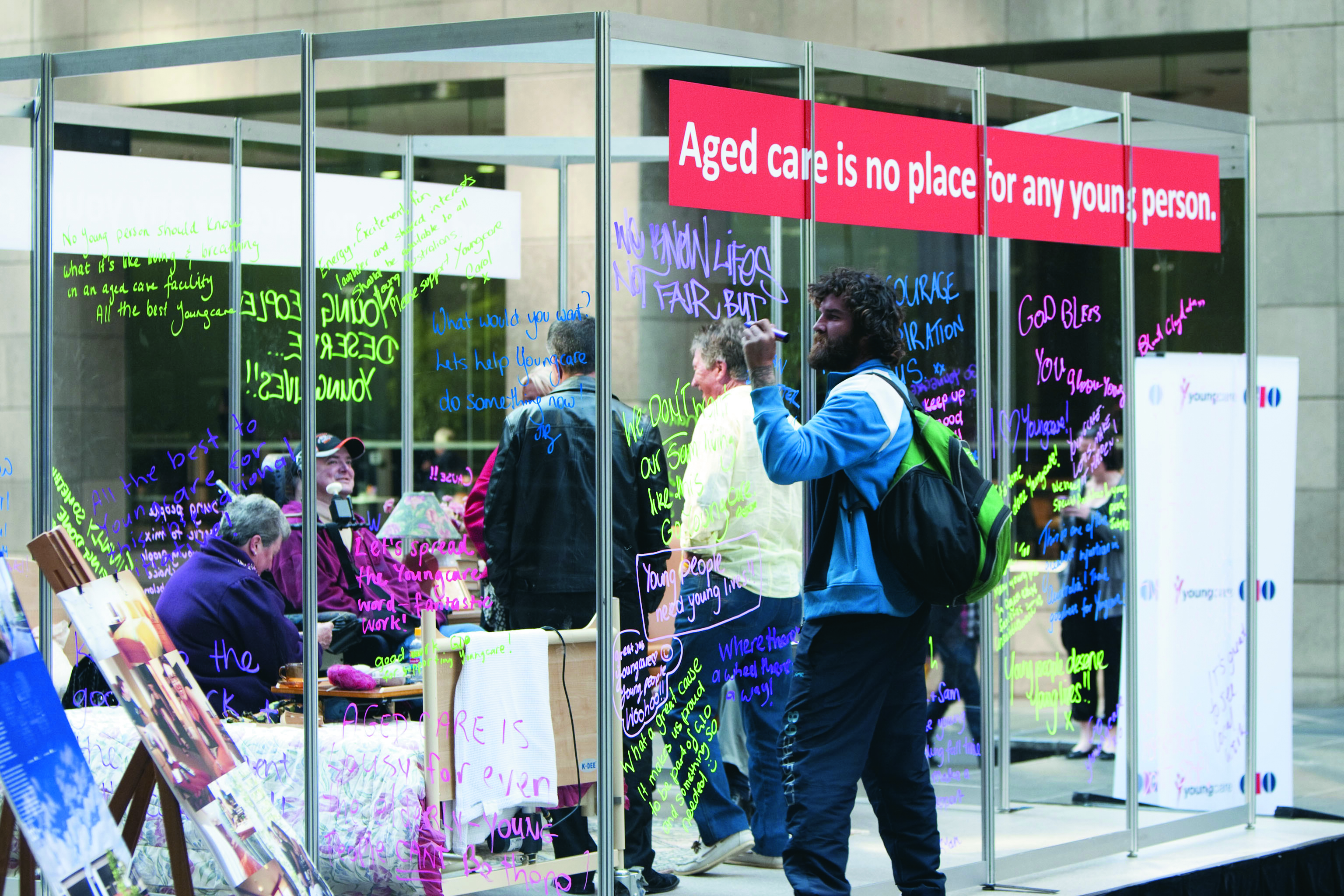 Two old people and a wheelchair-bound man in a Perspex box was one of the more unusual sights at Martin Place on a weekday morning. The point that young disabled people should not be put in old people’s homes was powerfully made in an enclosure that looked, felt and even smelt like the real thing. Encouraging the public to write what they thought about the issue on the side of the box helped garner support for the charity and generate added publicity. The medium truly was the message.