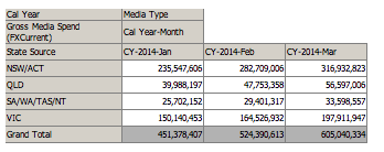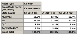 The new data shows New South Wales dominates aggregated advertising expenditure data with more than 52 per cent of spending, or $316m, in March followed by Victoria on $197m (32.7 per cent), Queensland on $56.5m (9.4 per cent), while a combined tally for South Australia, Western Australia, Tasmania and the Northern Territory saw only $33m, or 5.6 per cent, of spend.