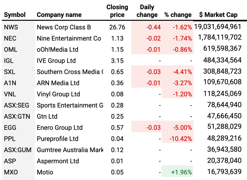 It was a similar story across the broadcast sector with ARN Media losing another 3.3% to hit yet another all-time low market capitalisation of just under $110m. Nine lost 1.7%.