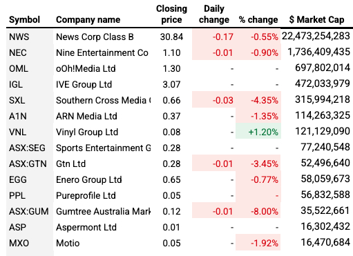 Gumtree joined Southern Cross in losing big (-8%, but to be fair it’s a small cap). GTN was down 3.45%. Motio fell 1.92%, ARN was down 1.35%, Nine fell 0.90%, Enero was down 0.77% and News Corp slipped 0.55%. Ooh Media and Ive were flat, as were Sports Entertainment Group, Pureprofile and Aspermont.