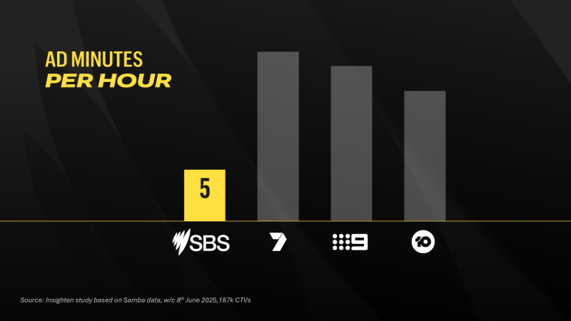 SBS Media national sales manager Keiran Beasley cited an Ehrenberg Bass study that he said indicated SBS could deliver “between 32 and 47 per cent better recall than our free-to-air competitors.” SBS’ ad load compares favourably (for audiences) to the approximately 12 minutes per hour of fully commercial TV.