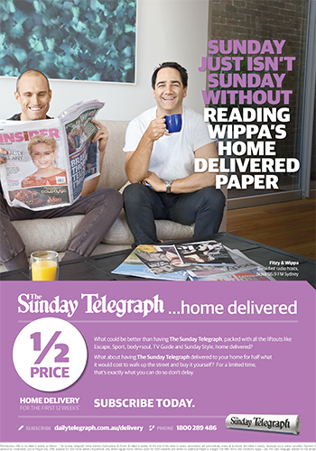 It is the first campaign by creative agency Archibald Williams since it was handed the full News Corp account, and sees a four week campaign concentrating on radio and supported by print that features Matt Moran, Jarryd Hayne and Fitzy & Wippa saying what they love about Sundays.