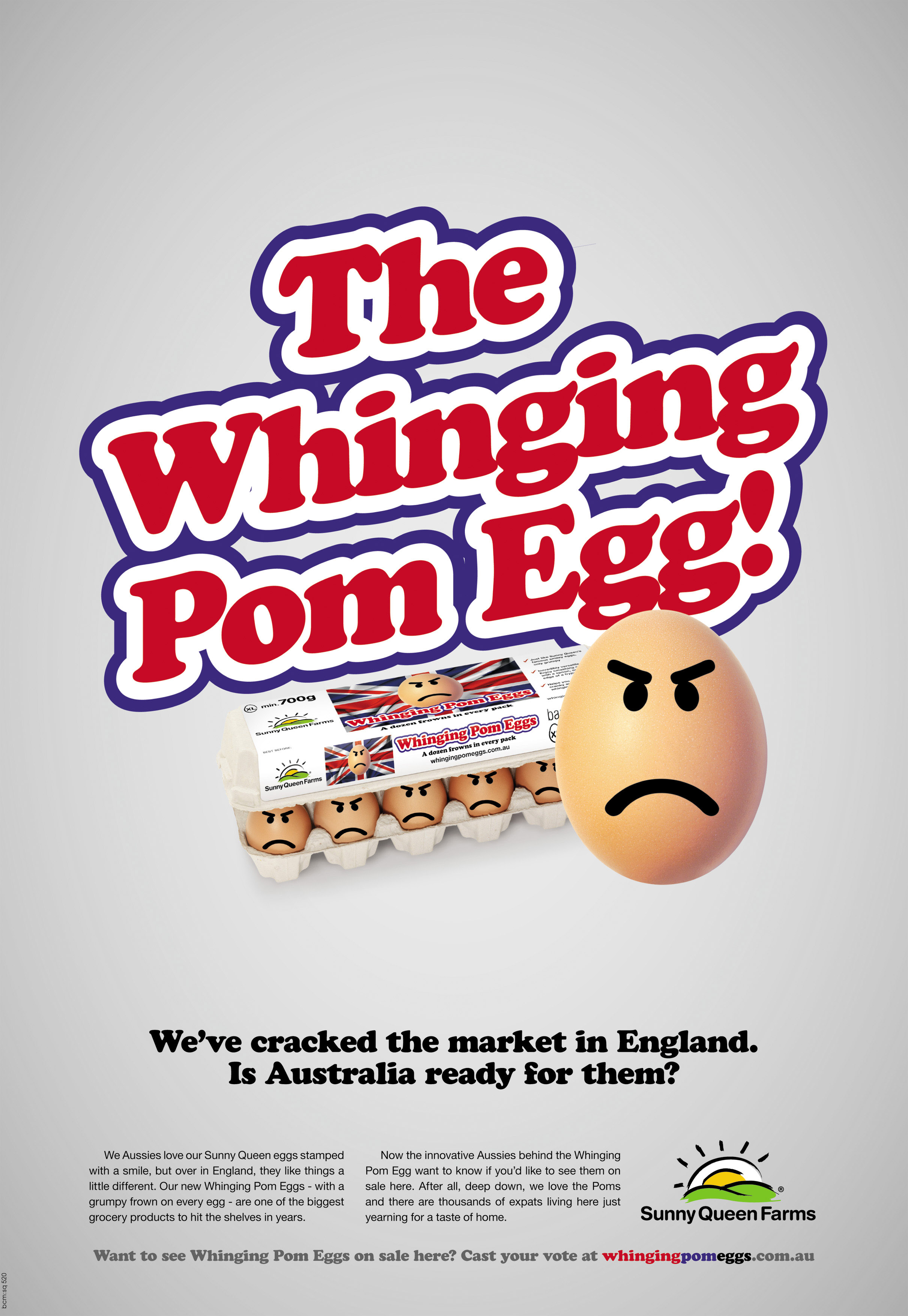 Backed with print and online, the campaign asks consumers to vote on whether there should be a Whinging Pom Eggs brand.