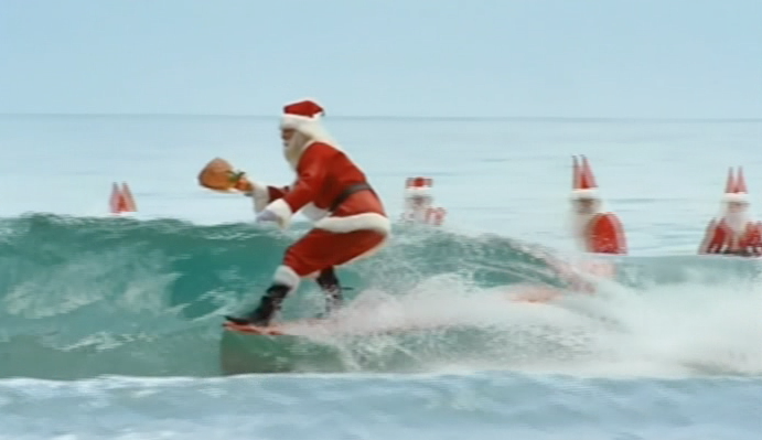 One Santa catches a wave while holding a large chunk of ham. A jingle mixed from classic surf anthem Hawaii Five-0 and Santa’s ‘Ho, ho, ho’ laugh plays in the background.