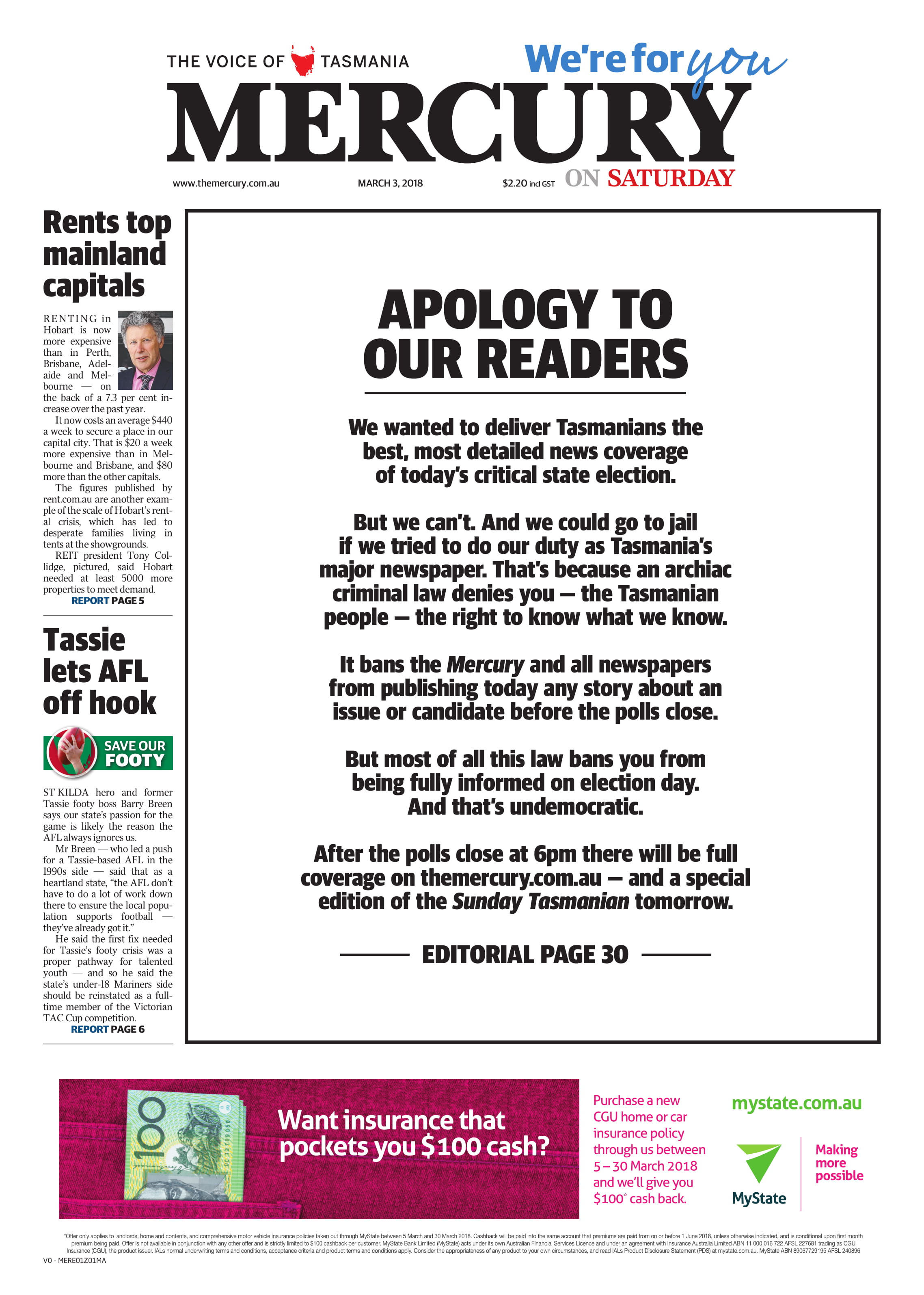 Tasmania’s Mercury issues apology to readers during election coverage ban