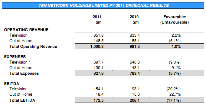 Ten has revealed its financial results for the financial year ending August 2011, with earnings before tax down more than 17%.