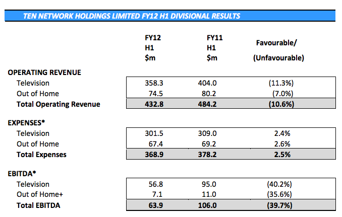 Ten has announced a 10.6% drop operating revenue and an almost 40% plunge in EBITDA in its first half results.