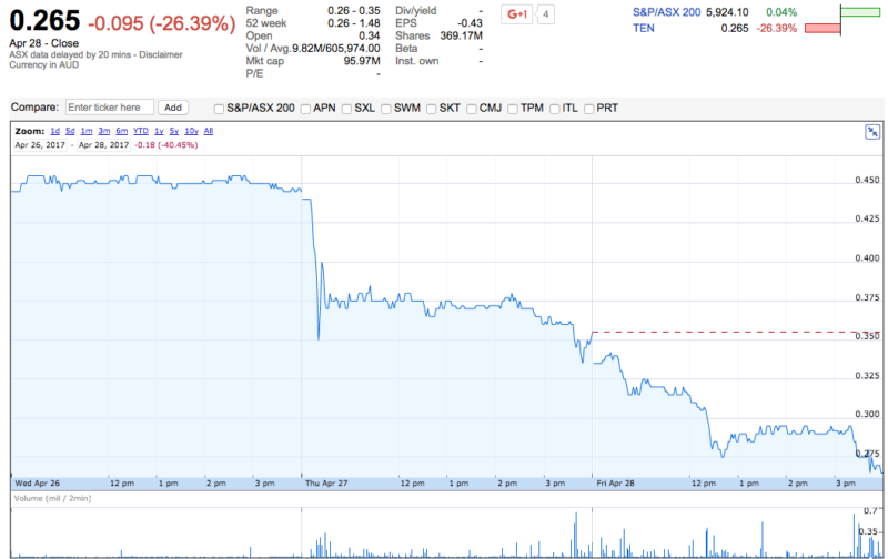 The trend continued on Friday with panicked investors deserting Ten, driving the share price down from 36 cents at opening to close at 26 cents, carving a further 26.3% from the value of the company.