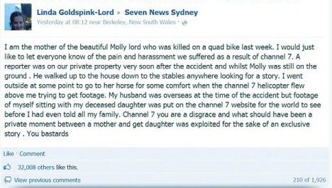 When Seven News deleted a comment with 32,000 likes on its Facebook page from Linda Goldspink-Lord accusing the network of intrusive reporting of her 13-year-old daughter Molly Lord’s accidental death near Wollongong, NSW, social media uproar ensued, forcing the network to make a public apology.