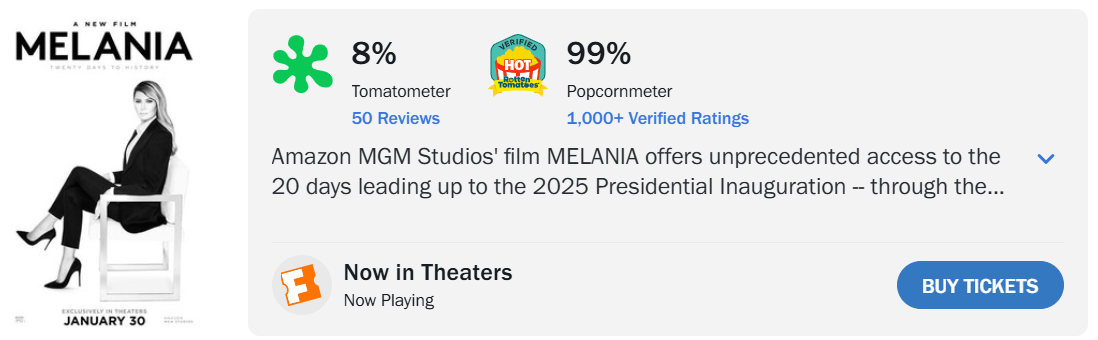 Rotten Tomatoes has been forced to issue a statement defending the gulf between the 8% critics rating the Melania documentary has received and the 99% audience review aggregate on its platform, leading many to question if the results for the latter had been manipulated.