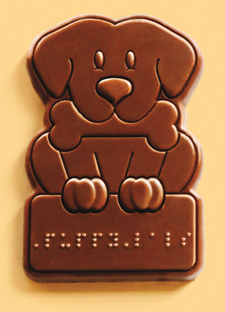 The words Puppy Pals appears in braille on the milk chocolates, offering people an experience shared by the vision impaired.