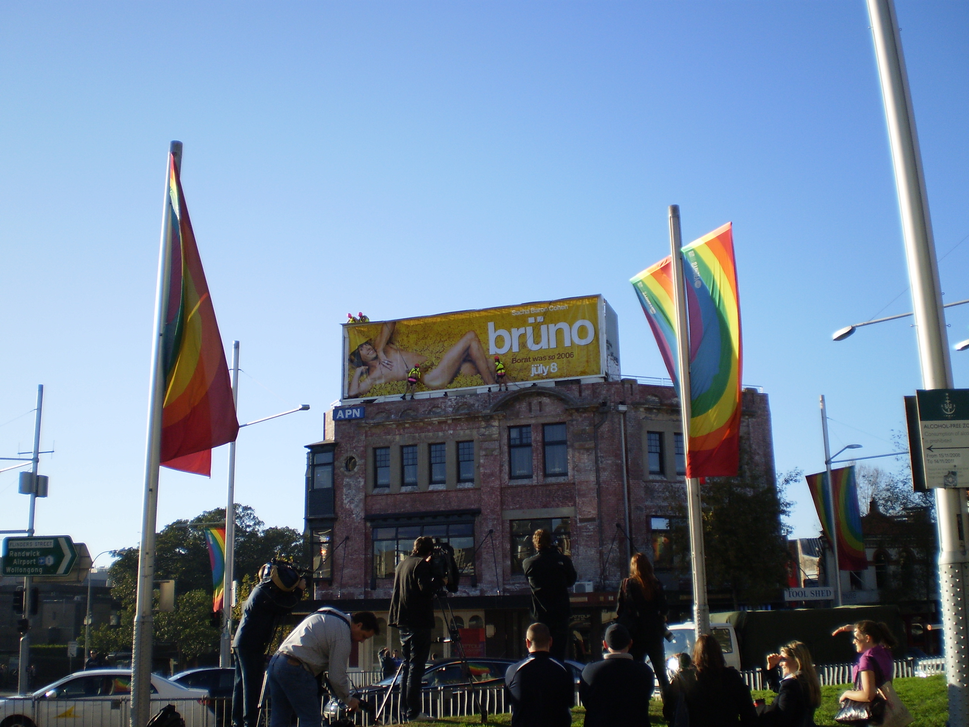 Sydney’s Oxford Street played host to possibly the most flamboyant installation of a new outdoor ad of all time, as a billboard for Universal Pictures’ new Sacha Baron Cohen movie Bruno was erected on the APN Outdoor site overlooking Taylor Square.