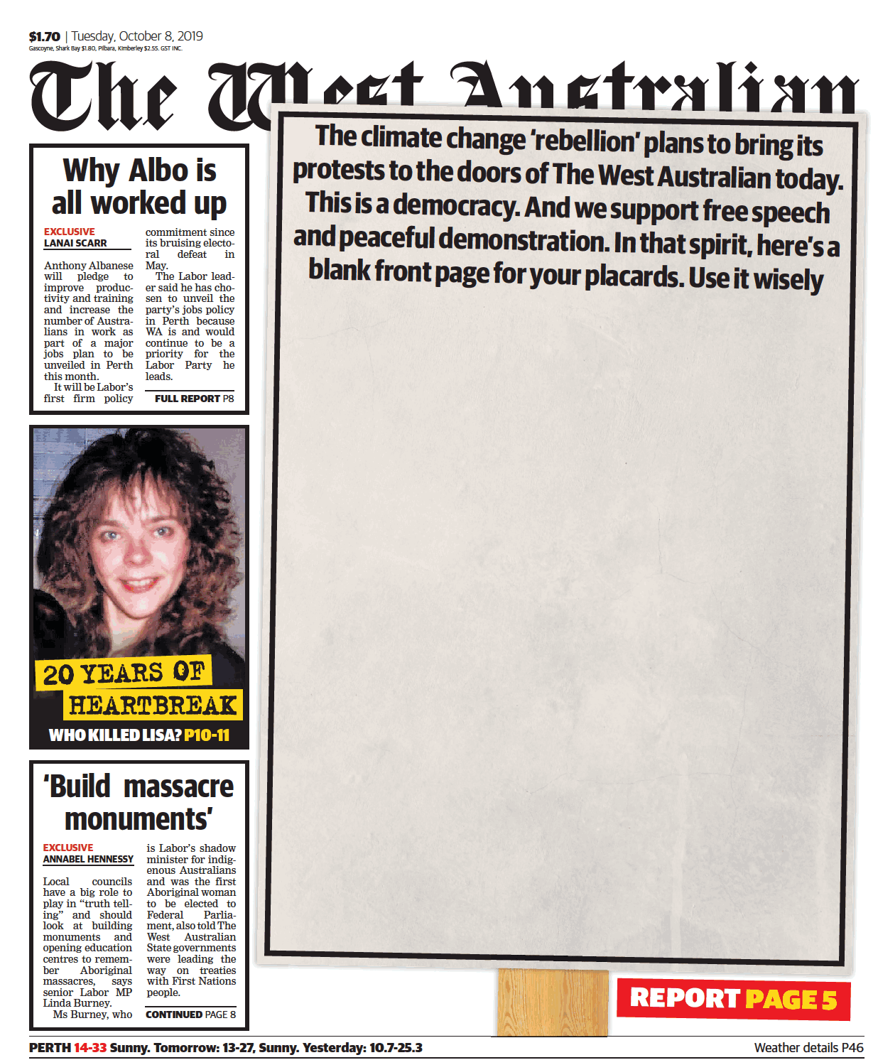 Seven West Media’s newspaper The West Australian is baiting climate change protesters with a blank front page.