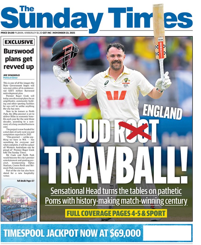 There were plenty of puns linked to match-winner Travis Head on Sunday — this one stood out (an even more doubtful earlier front page was changed)