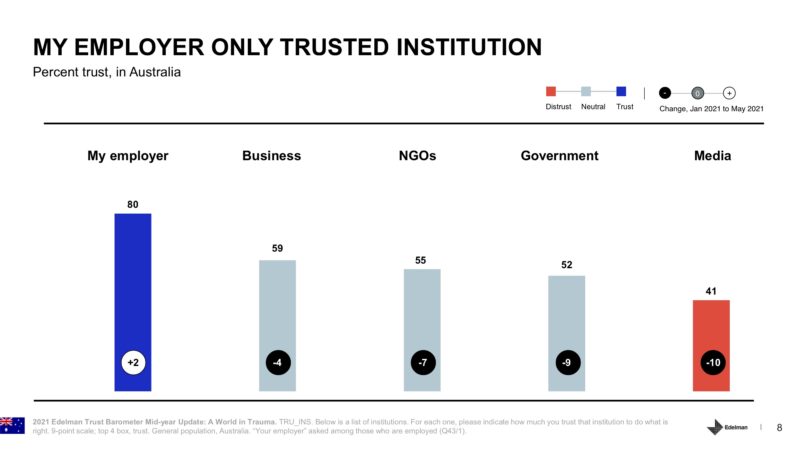 Edelman’s most recent Australian survey, which measured the levels of trust in Australia’s institutions at the end of May 2021, shows trust fell sharply across all four major institutions: media, government, NGOs and business.