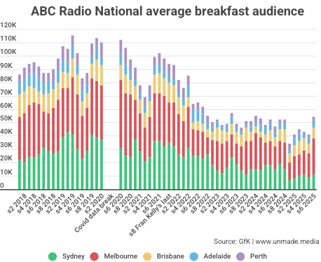 However, what is true is that Radio National’s breakfast show saw its biggest one-survey jump in audience numbers since the early days of Covid.