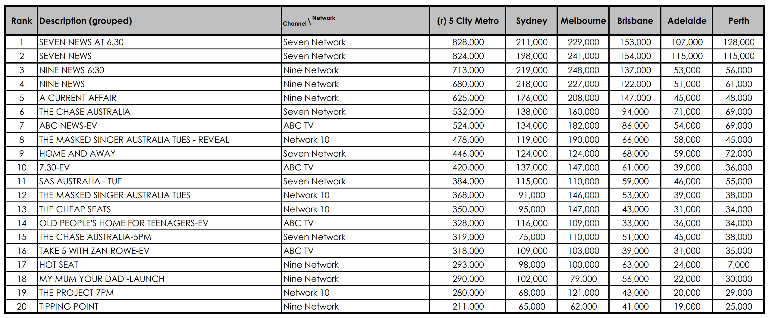The Chase pulled 532,000 early-evening viewers for Seven, while in the evening The Masked Singer reveal managed to land in the top ten, with 478,000 viewers across the five metro areas. SAS Australia drew 384,000 for Seven, while The Masked Singer’s first half-hour, and The Cheap Seats also performed well for Ten.