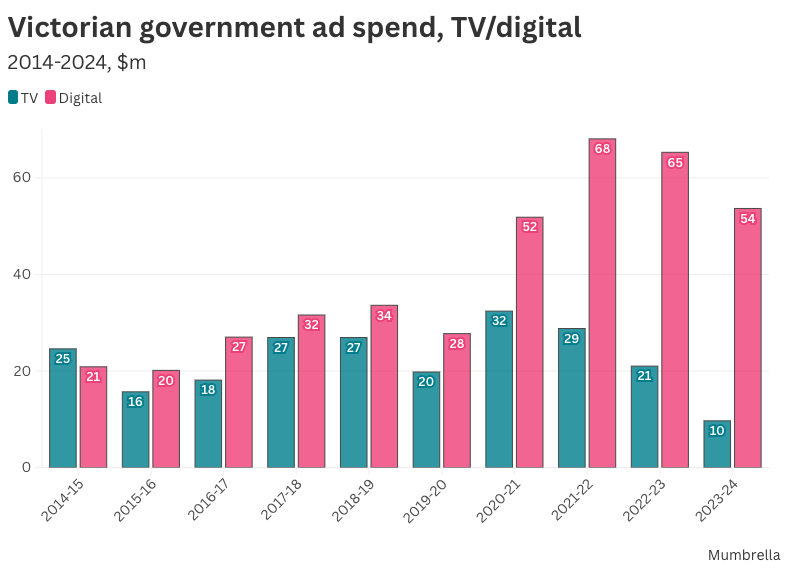 The collapse of TV has been mirrored by a surge in digital advertising, which grew from 22% of the state’s media spend in 2015-16 to more than half by 2023-24, a real-term spend of $53.6 million.
