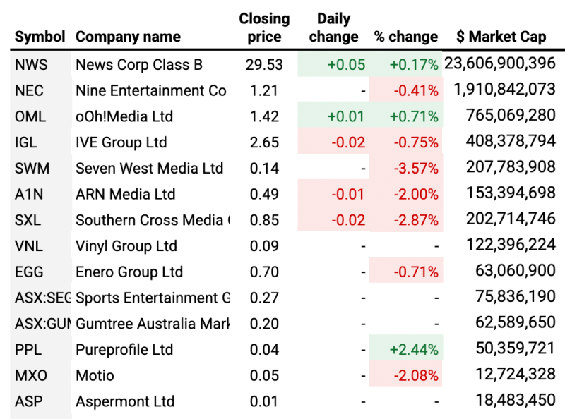 It was a bad start to the week across the broadcast sector. Nine lost 0.8% while ARN Media declined by 2%.